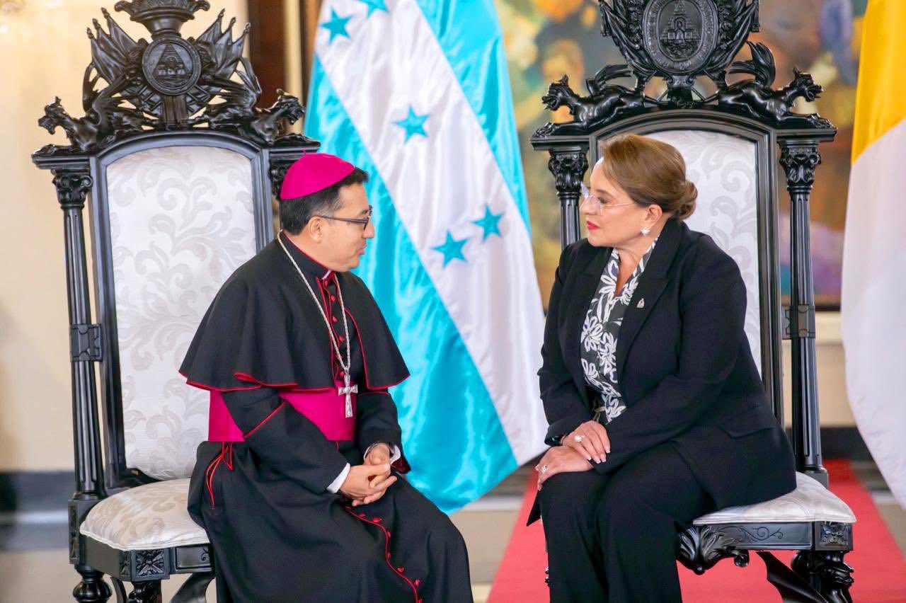 La presidenta de la Repรบblica, Xiomara Castro de Zelaya, recibiรณ este dรญa en Casa de Gobierno las Cartas Credenciales del Reverendรญsimo Monseรฑor Simรณn Bolรญvar Sรกnchez Carriรณn, nuevo Nuncio Apostรณlico de la Santa Sede en Honduras.