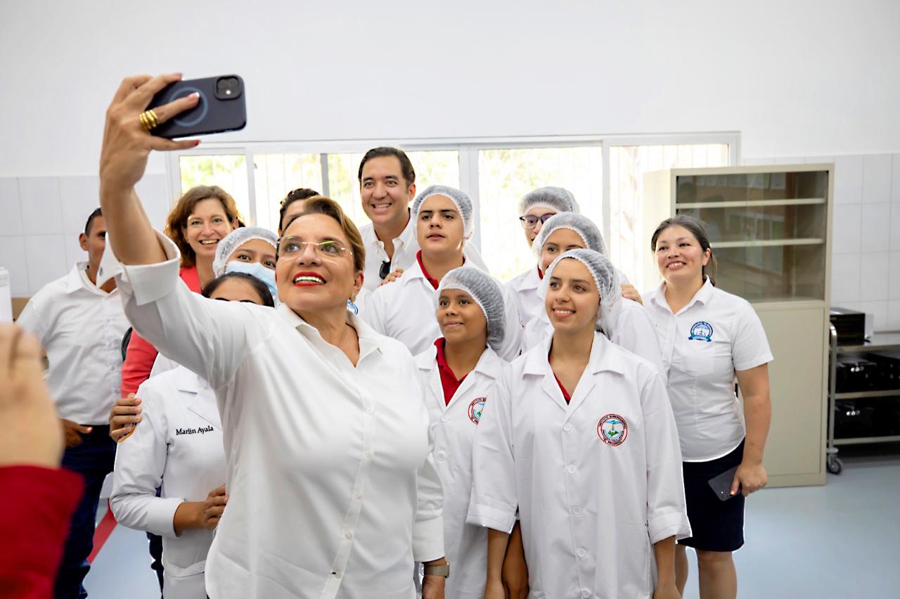 La mandataria estuvo acompañada por el secretario privado de la Presidencia, Héctor Manuel Zelaya; el viceministro de Educación, Edwin Hernández, y la embajadora de Alemania en Honduras, Daniela Vogl, entre otros funcionarios y representantes diplomáticos.