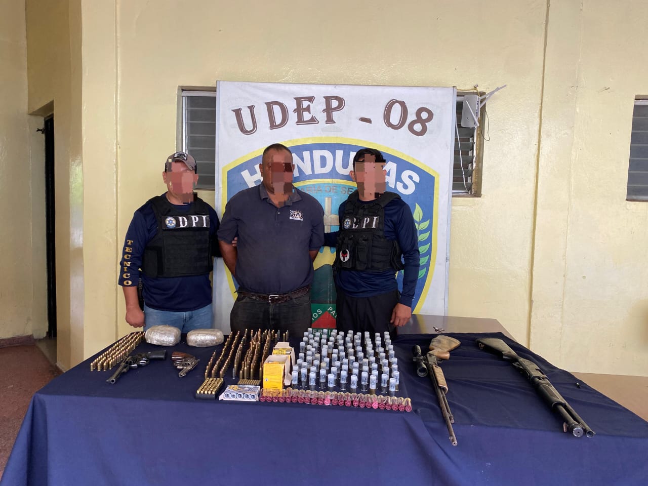 La detención se realizó en la aldea Zapatero del municipio de Talanga, donde fue capturado un ciudadano de 50 años, originario y residente de la misma aldea donde se dio su arresto, se le encontró en posesión de dos libras de marihuana, un arma de fuego tipo revólver calibre 357, un arma de fuego tipo revólver calibre 38 mm, un arma de fuego tipo fusil sin marca ni serie, un arma de fuego tipo escopeta, 98 cartuchos sin percutir color blanco calibre, 12 mm, 115 cartuchos de color amarillo calibre 22 y 44 cartuchos color amarillo y 49 casquillos 20 mm.