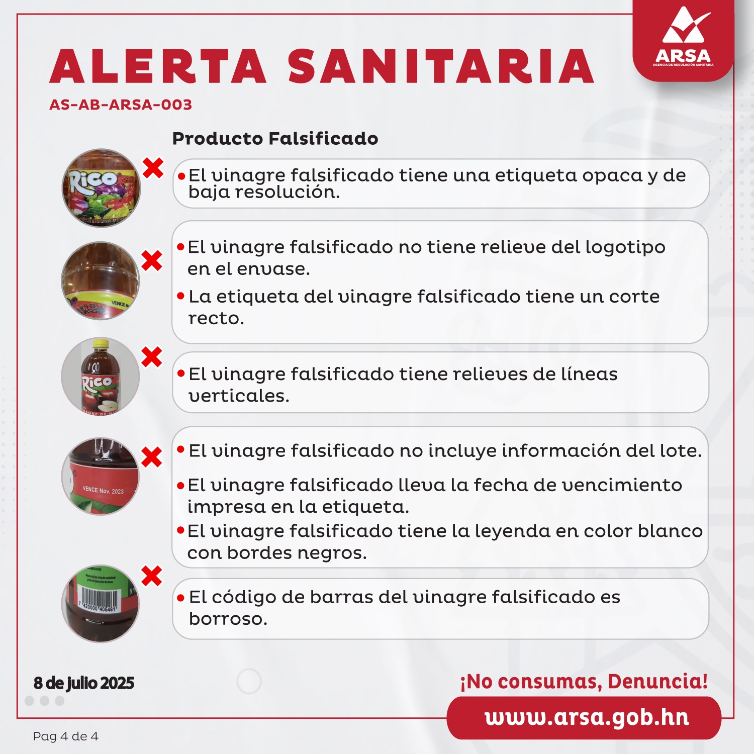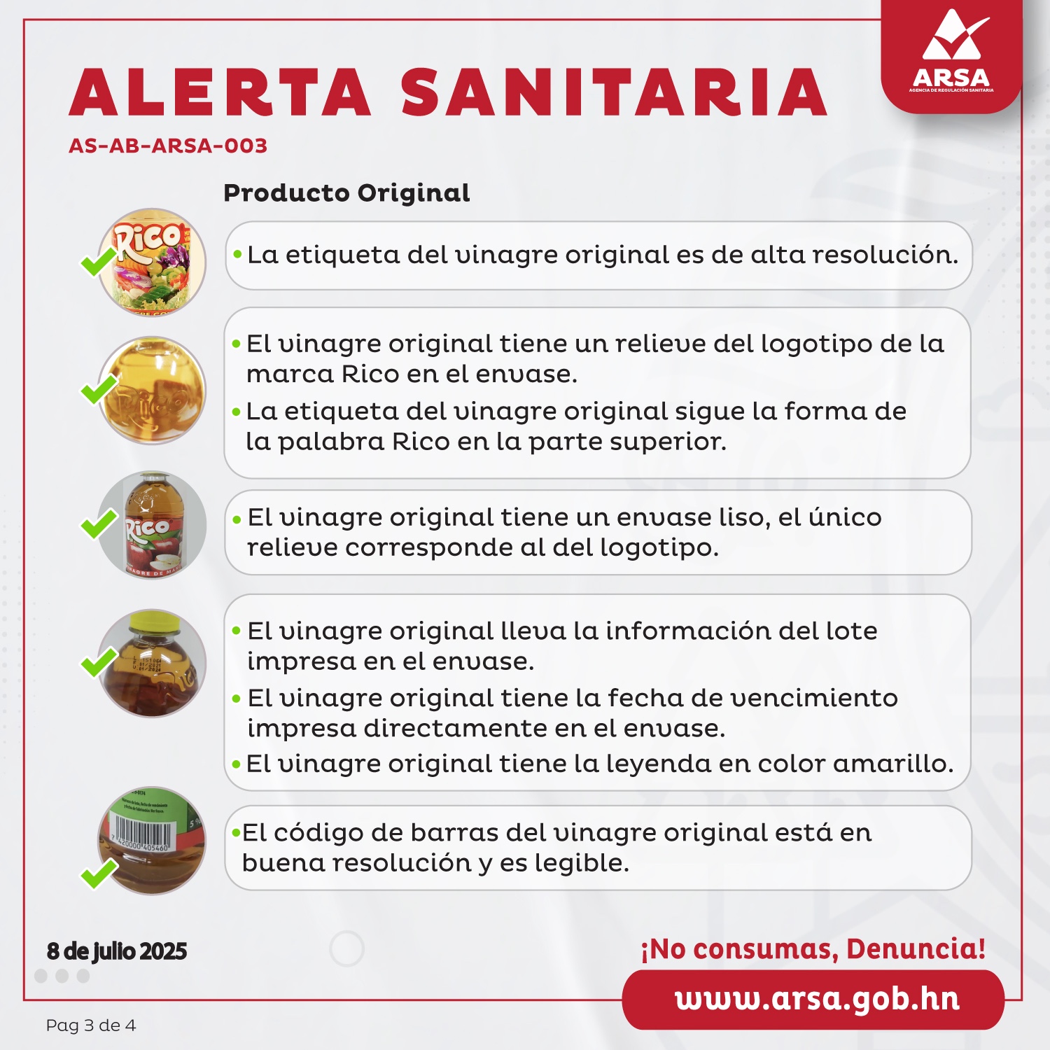Tegucigalpa, 8 de julio de 2025.- La Agencia de Regulación Sanitaria (ARSA) ha emitido la alerta sanitaria AS-AB-ARSA-003 tras detectar la circulación en el mercado hondureño de productos falsificados que se hacen pasar por “Vinagre Rico Condimentado” y “Vinagre Rico de Manzana”. Estos productos adulterados no cumplen con los estándares de calidad y seguridad exigidos, representando un riesgo directo para la salud de los consumidores.
