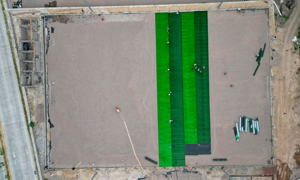 En el nuevo anunció la obra refleja mucho progreso, como el inicio de instalación de la grama sintética en una de las tres canchas.