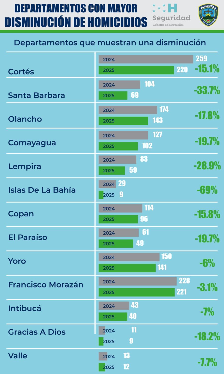 Los departamentos con mayor reducción son: Santa Bárbara (-33.7%), Islas de la Bahía (-69.0%), Lempira (-28.9%), Olancho (-17.8%) y Cortés (-15.1%), reflejando avances significativos en zonas de alta incidencia delictiva. Asimismo, el informe detalla que el 89.3% de las víctimas son hombres, con mayor incidencia en el grupo etario de 20 a 34 años. El 72.9% de los homicidios fueron cometidos con armas de fuego, mayormente en la vía pública, y los fines de semana registran la mayor incidencia de hechos violentos.