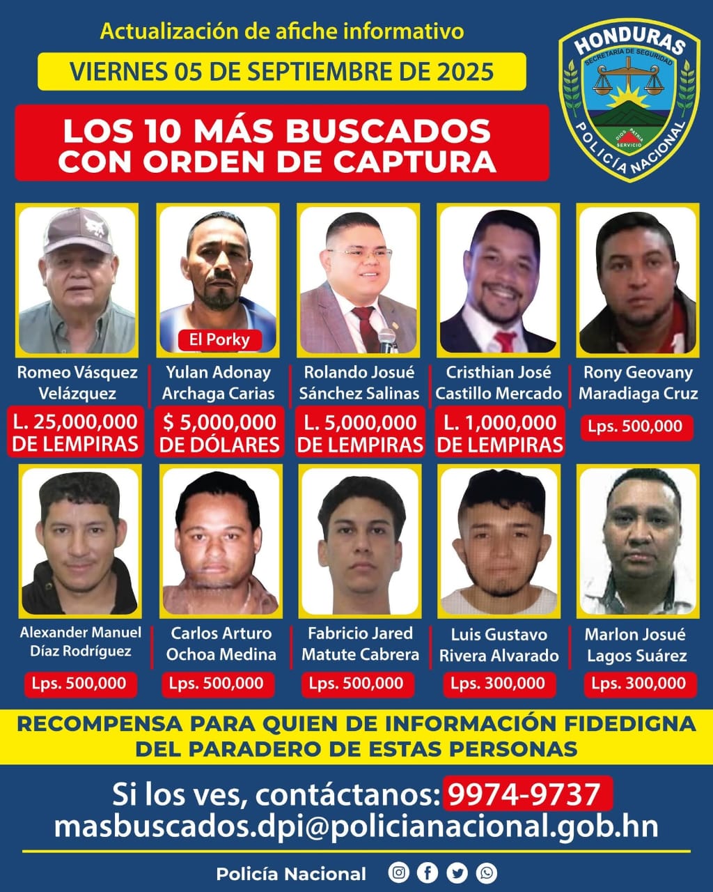 Desde marzo de 2025, cuando se emitió la primera recompensa de 500.000 lempiras, el monto ha ido aumentando progresivamente: 1 millón, 2 millones, 3 millones, 3,5 millones, 5 millones, 10 millones, 15 millones, 20 millones, y este viernes 5 de septiembre, finalmente 25 millones de lempiras, representando un incremento de 5 millones más.
