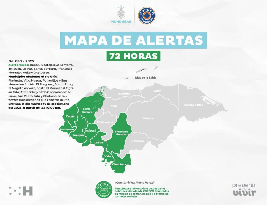 La Secretaría de Estado en los Despachos de Gestión de Riesgos y Contingencias Nacionales (COPECO) declaró este martes alerta verde por 72 horas en los departamentos de Copán, Ocotepeque, Lempira, Intibucá, La Paz, Santa Bárbara, Francisco Morazán, Valle y Choluteca.