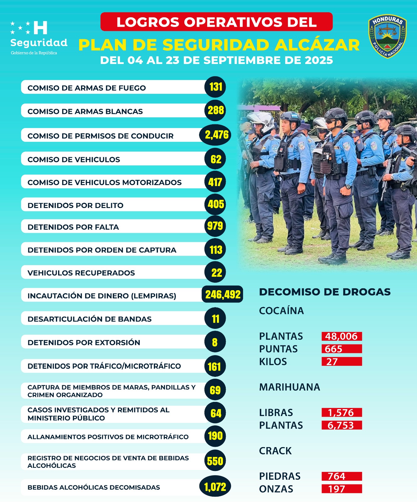 La Policía Nacional de Honduras, a través de sus unidades especializadas desplegadas en distintos puntos del país, dio a conocer los resultados alcanzados con la ejecución del Plan de Seguridad Alcázar entre el 4 y el 23 de septiembre de 2025. Las acciones se concentraron en municipios de mayor incidencia delictiva, logrando avances significativos en materia de seguridad ciudadana.