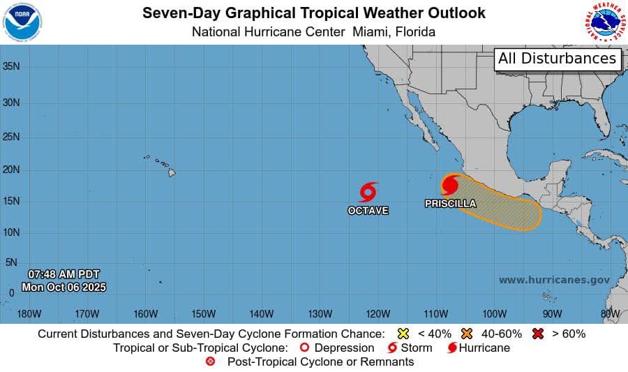 El huracán Priscilla, ubicado a 350 km al sur-suroeste de Cabo Corrientes, México, se desplaza hacia el noroeste. Según COPECO, no representa amenaza para Centroamérica. De manera similar, la tormenta tropical Octave, localizada a 1,425 km al oeste-suroeste del extremo sur de Baja California y desplazándose hacia el norte-noreste, no representa riesgo para la región.