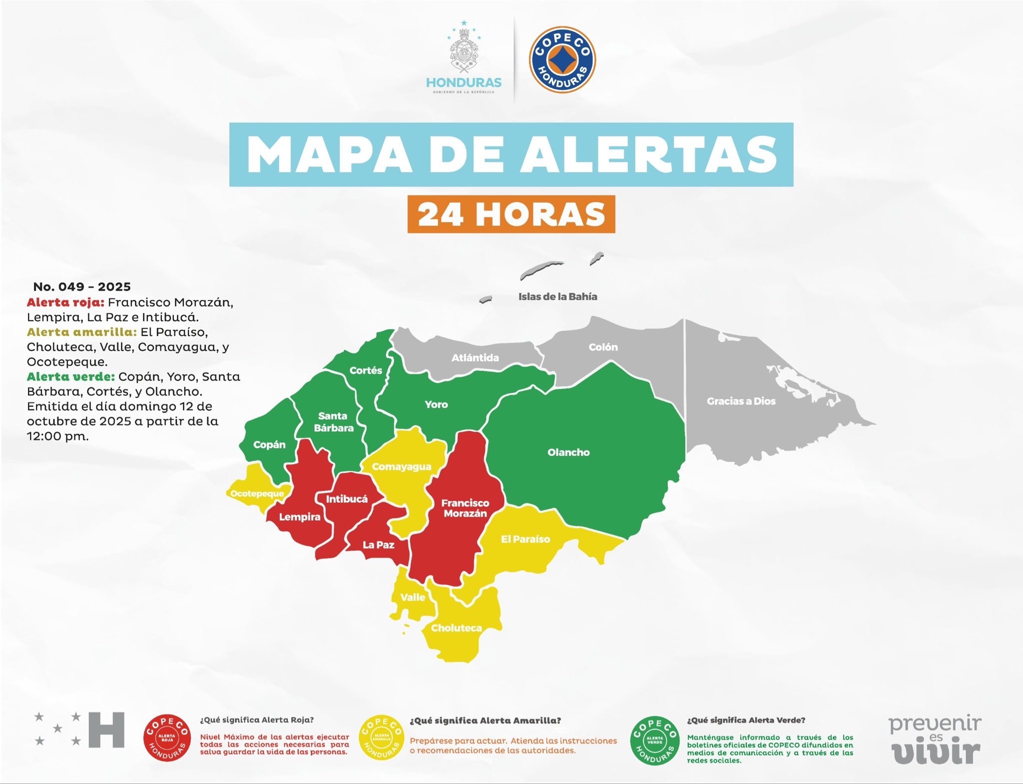 Se mantiene la Alerta Verde para Copán, Yoro, Santa Bárbara, Cortés y Olancho, por un período de 24 horas, a partir de las 12:00 del medio día del domingo 12 de octubre de 2025.