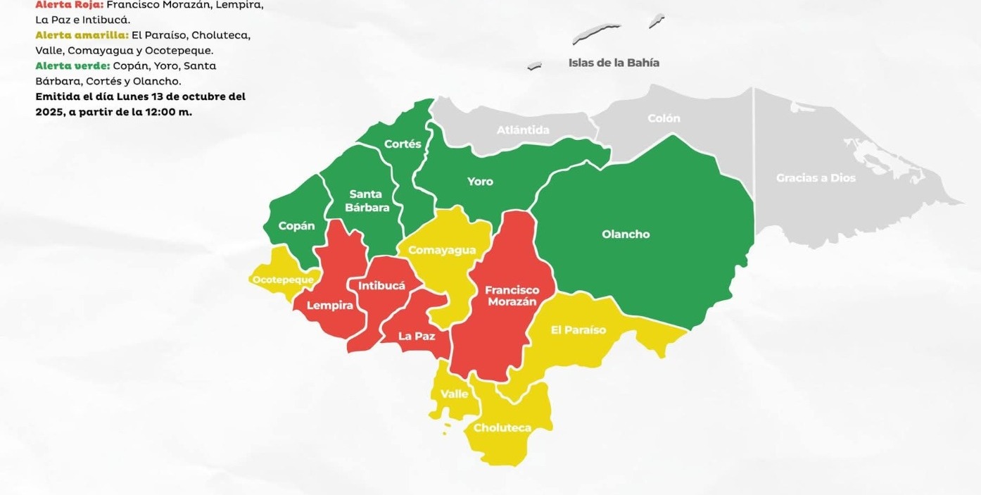 La Secretaría de Estado en los Despachos de Gestión de Riesgos y Contingencias Nacionales (Copeco) extiende la Alerta Roja para los departamentos de Francisco Morazán, Lempira, La Paz e Intibucá. Asimismo, se amplía la Alerta Amarilla para los departamentos de Choluteca, Valle, Comayagua, Ocotepeque y El Paraíso. Se mantiene la Alerta Verde para Copán, Yoro, Santa Bárbara, Cortés y Olancho, por un período de 24 horas, a partir de las 12:00 del mediodía del lunes 13 de octubre de 2025.