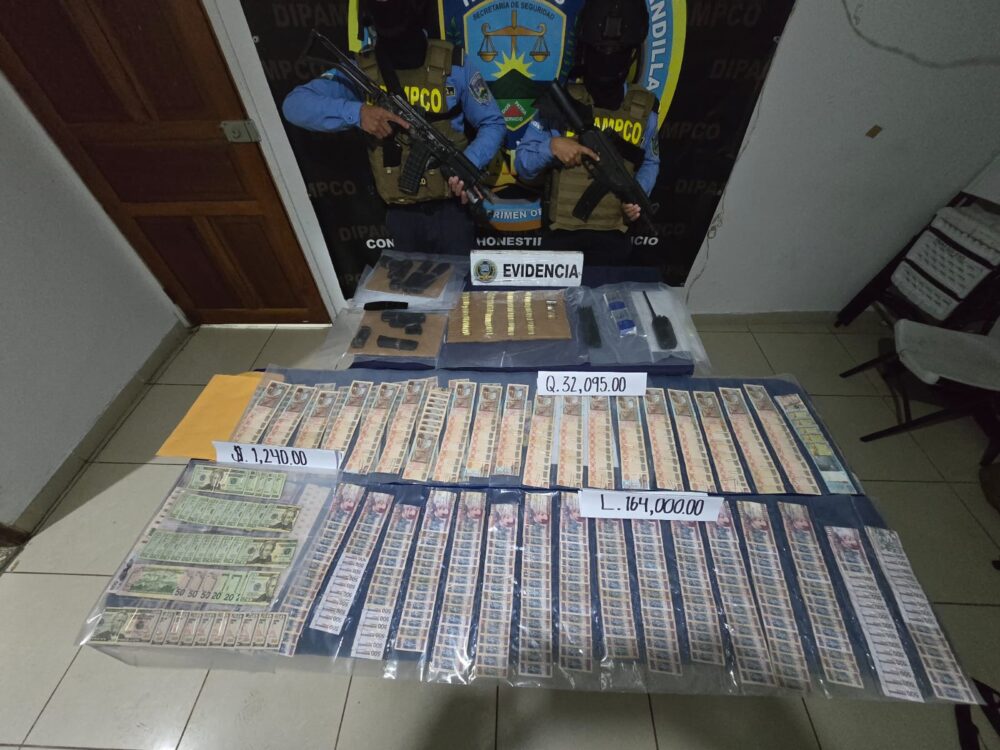 En un contundente golpe a las estructuras del narcotráfico que operan en el occidente del país, la Dirección Policial Anti Maras y Pandillas Contra el Crimen Organizado (DIPAMPCO) decomisó una fortuna en efectivo que supera los L. 300,000 en tres diferentes divisas, junto con un arsenal, siendo esto sinónimo de debilitamiento a los grupos delictivos.