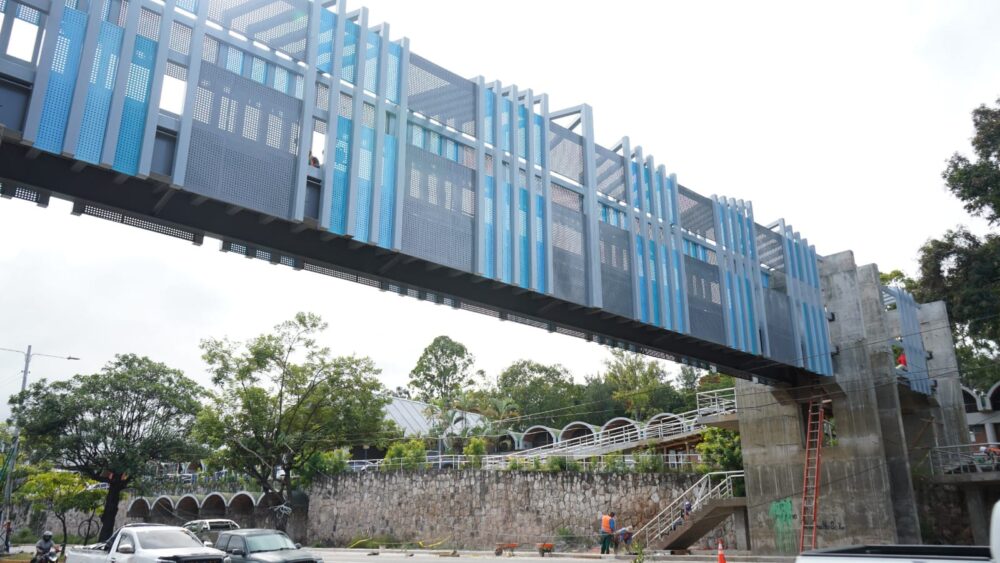 La instalación de las dos estructuras metálicas sobre las plataformas de concreto, marca un hito fundamental del proyecto, el cual avanza en un 67% y será entregado a inicios de diciembre para beneficiar a miles de capitalinos, entre ellos, estudiantes de la Universidad Pedagógica Nacional Francisco Morazán (UPNFM) y pacientes con discapacidad que acuden diariamente a Teletón a recibir sus terapias.