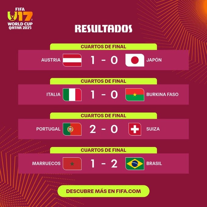 Tras los partidos de cuartos de final ya se conocen a las mejores cuatro selecciones que pelearán por el pase a la gran final del Mundial de futbol Sub-17 que se realiza en Catar.