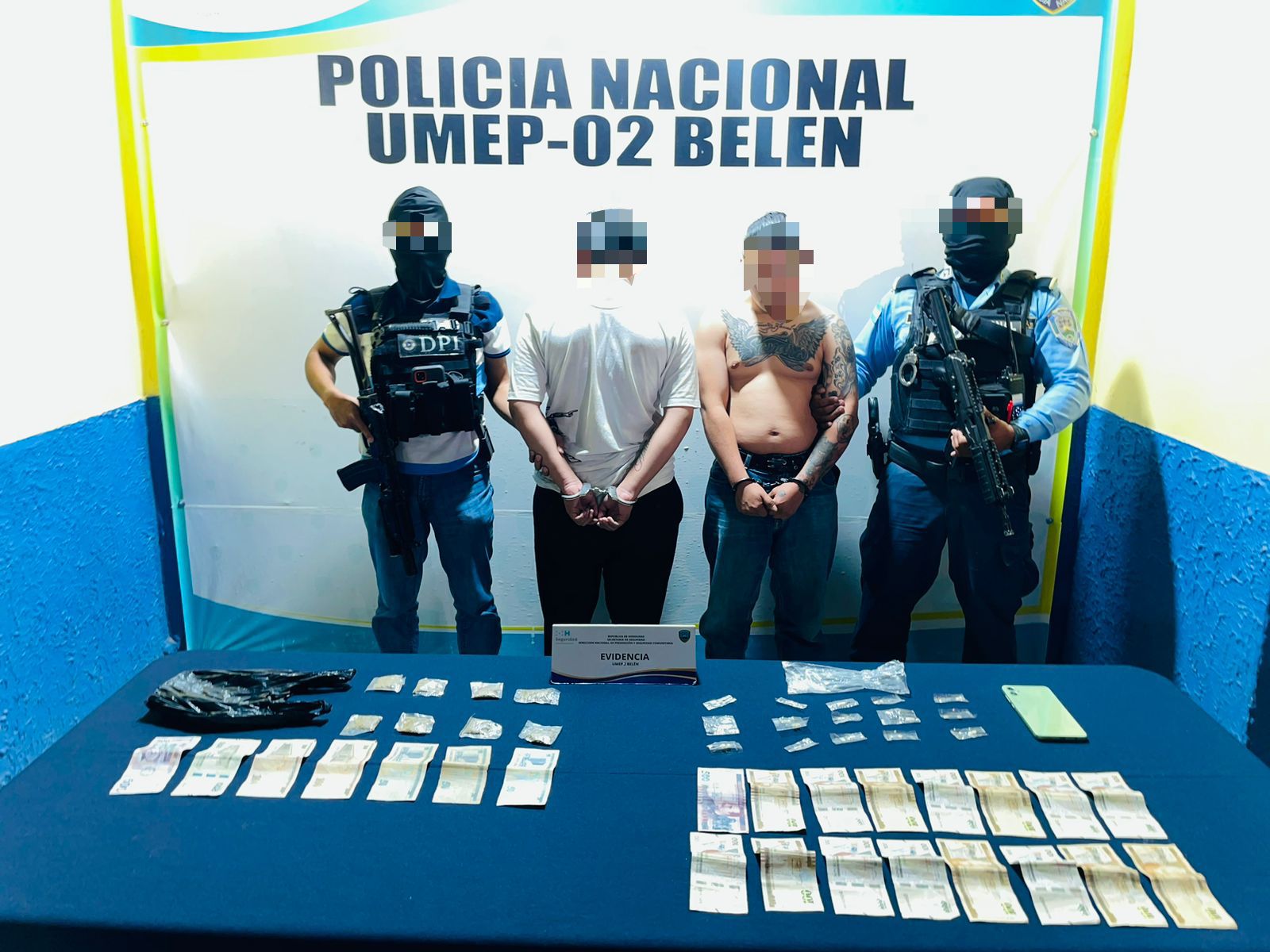 Al momento de su detención, se les decomisó la siguiente evidencia: 15 envoltorios plásticos con piedra crack, 8 envoltorios con marihuana y 3,050 lempiras en billetes de diferentes denominaciones y un teléfono celular.