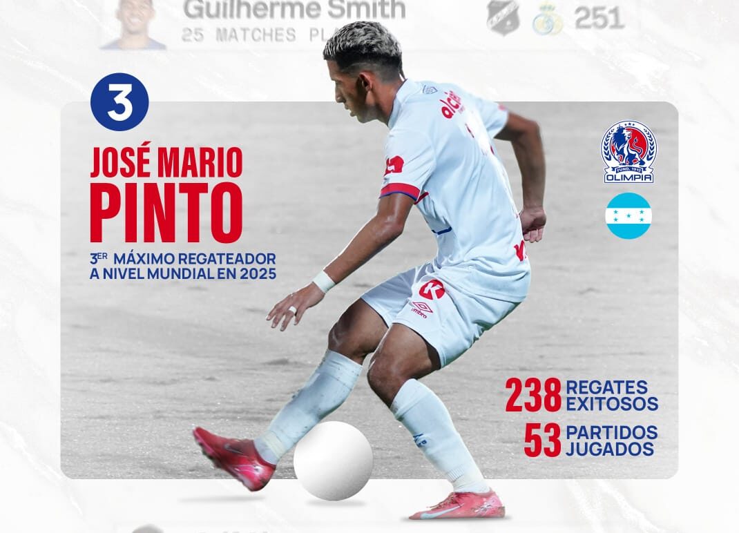 El mediocampista del equipo Olimpia, José Mario Pinto es el tercer jugador del mundo en realizar gambetas exitosas en el 2025.