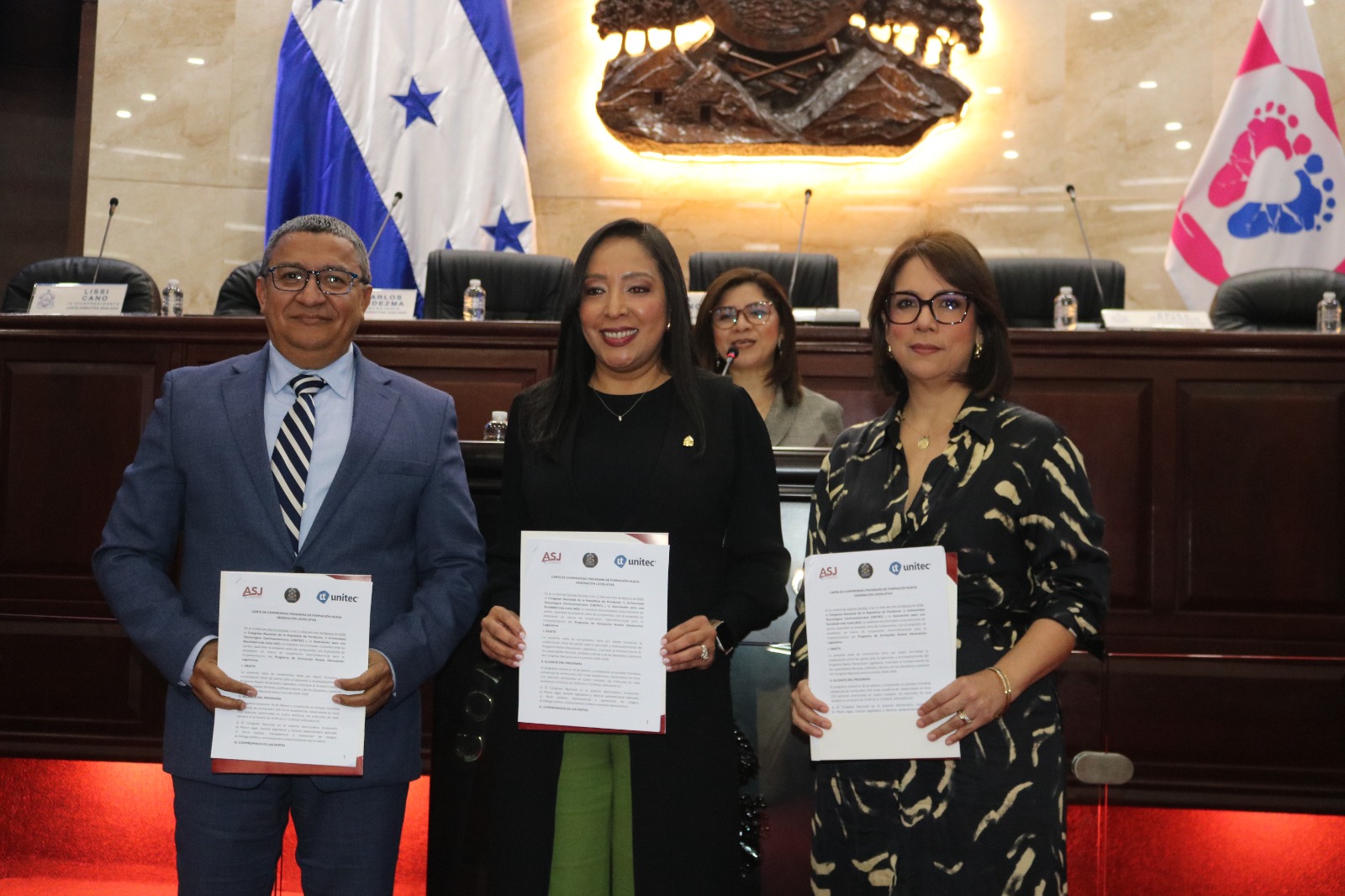 La carta de compromiso que marca el inicio del programa formativo fue firmada por: Lissi Matute Cano, vicepresidenta del Congreso Nacional; Rosalpina Rodríguez, rectora de Unitec, y Carlos Hernández, director ejecutivo de ASJ.