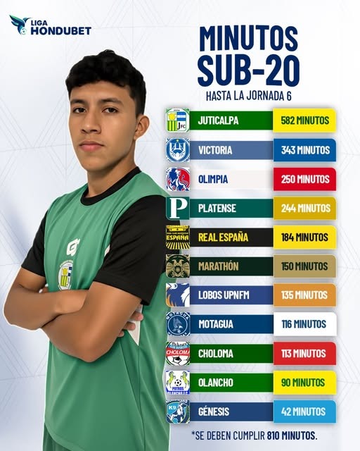 Deportes Juticalpa el club que más minutos sub20 acumula 18 de febrero de 2026 Por Redacción Los clubes de la Liga Nacional como normativa deben de cumplir 810 minutos de juego con un jugador menor de 20 años en cada torneo. Hasta la fecha 6, el equipo Juticalpa es el que más minutos acumula; mientras que el que menos suma es el Génesis FC. Advertisement Related Topics:Liga Nacional Up Next Félix Sabio reelecto en la Condepah No te lo puedes perder... Kervin Arriaga recibe duro castigo Continuar Leyendo