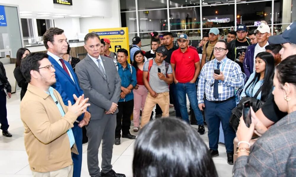 El secretario de Trabajo, Javier Fernández, junto al vicecanciller de Relaciones Exteriores, Tony García y el embajador de España en Honduras, Diego García Nuño, despiden a...